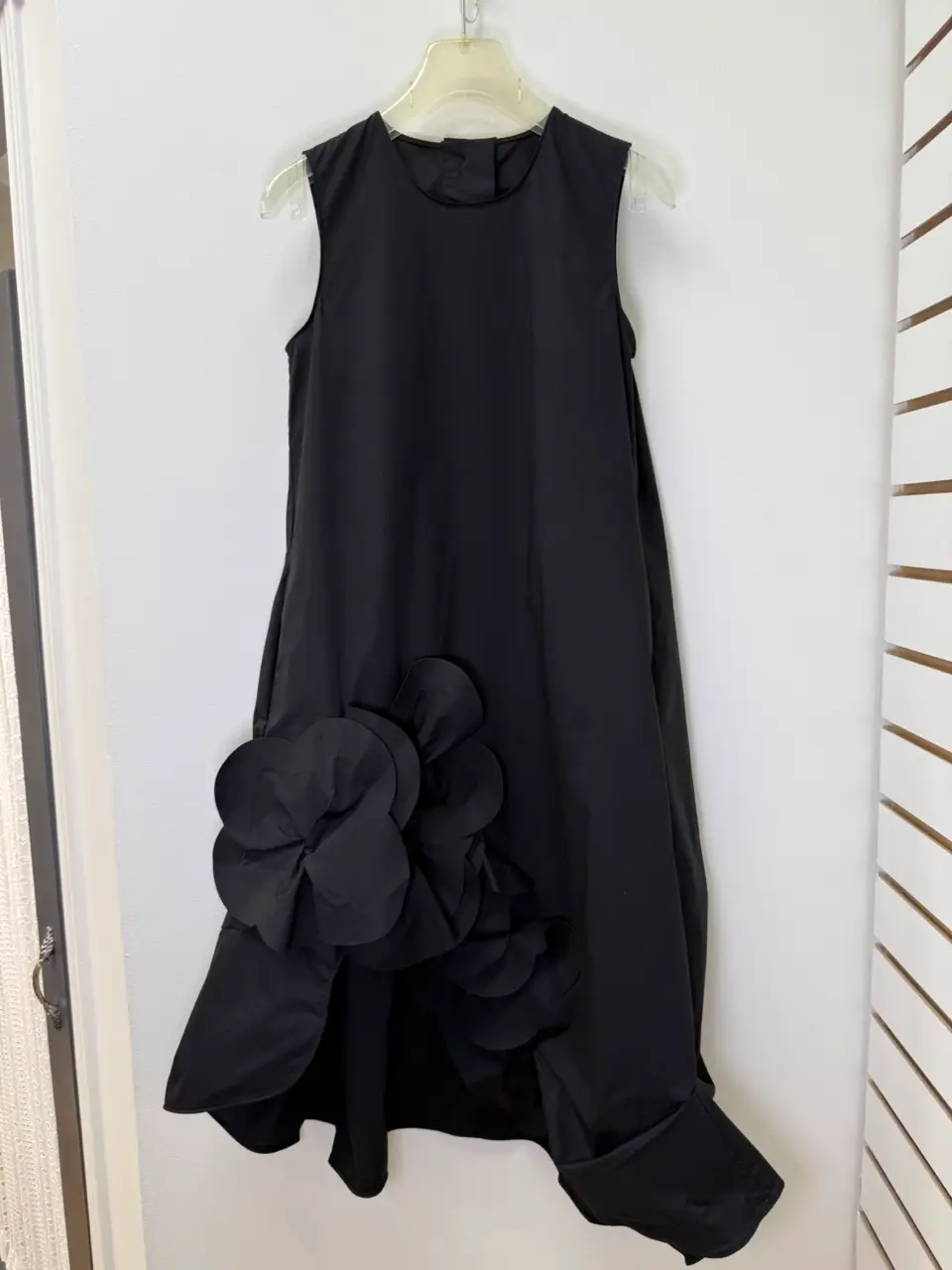 The JNBY black dress is a modern classic with a subtle black flower detail for added texture. Sleek, minimal, and effortlessly chic.