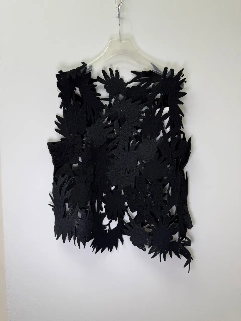 The JNBY black top features a subtle black flower design for a textured, modern look. Minimalist with a touch of artistic detail.