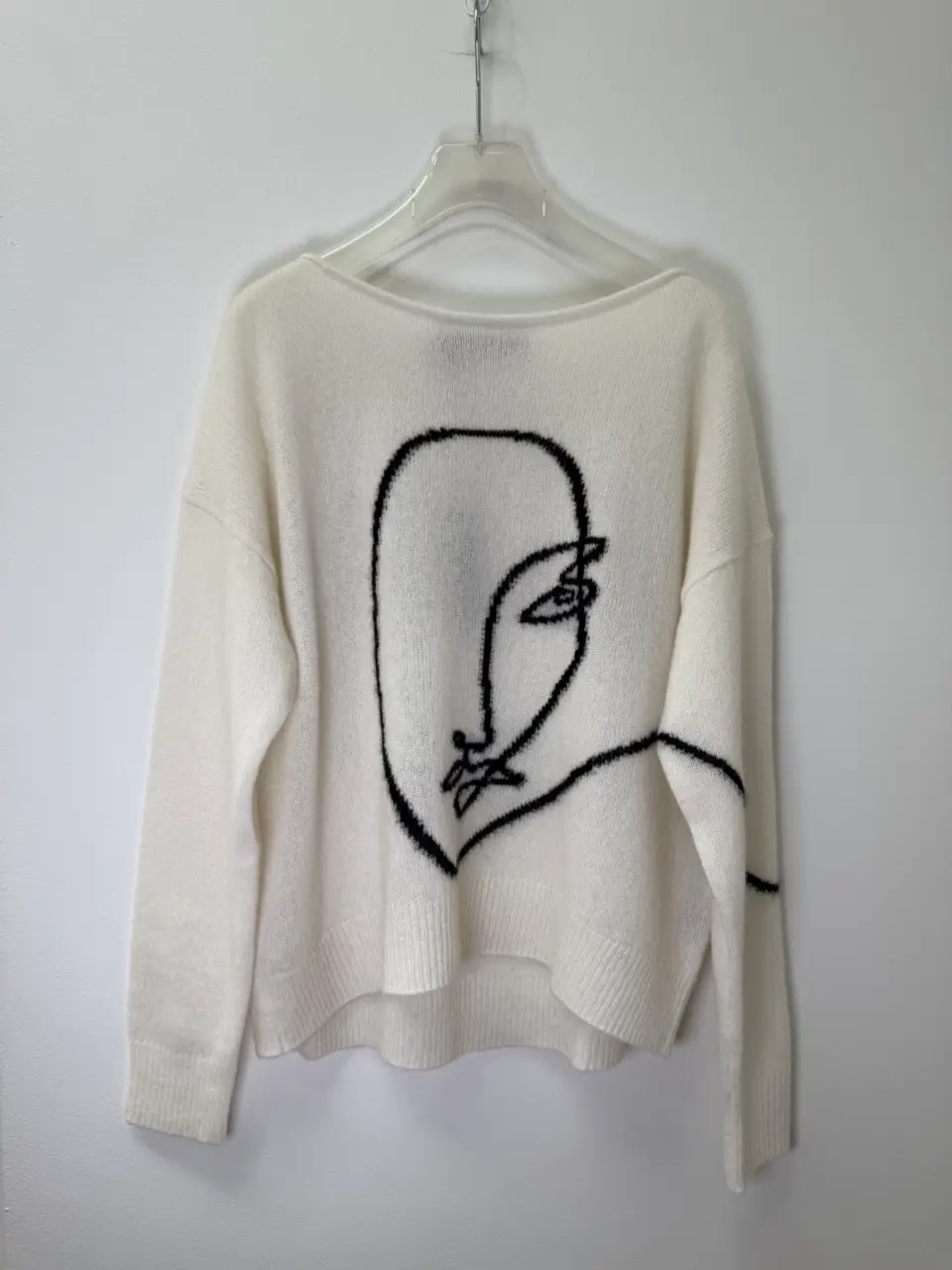 The 360 Cashmere white sweater features a bold face sketch for an artistic, modern touch. Soft, cozy, and effortlessly statement-making.