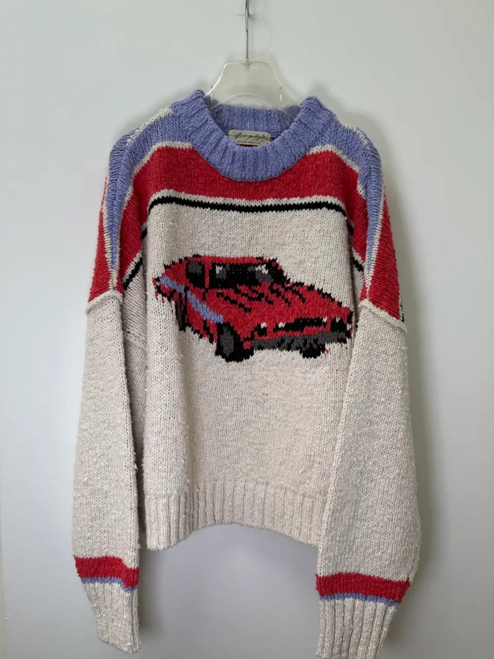 The Free People sweater with a red car graphic adds a playful, retro vibe to your look. Cozy, fun, and full of personality.