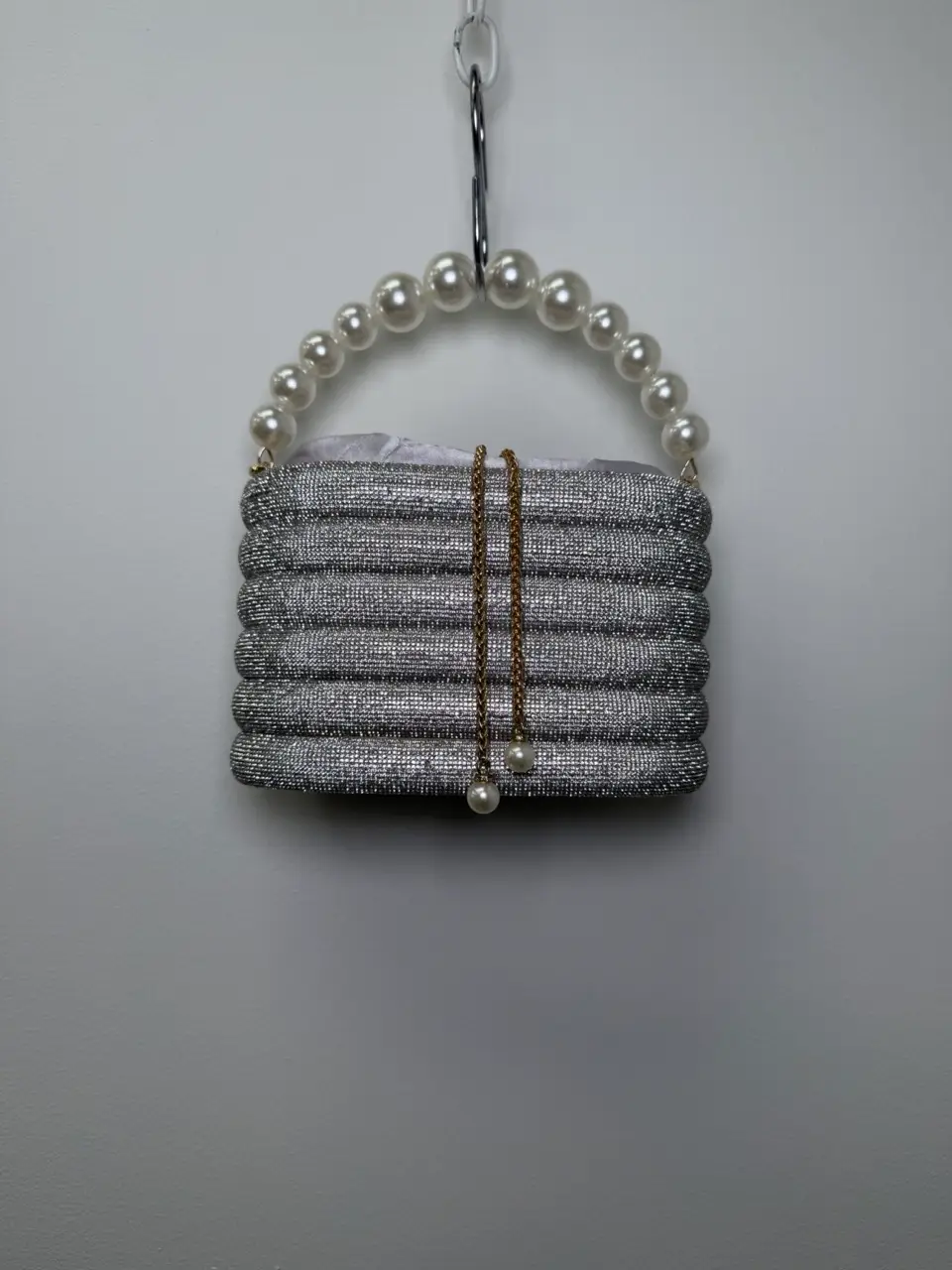 The sparkle and pearl handbag blends shimmer with elegant pearl accents for a standout accessory. A chic finishing touch for evening looks or events.
